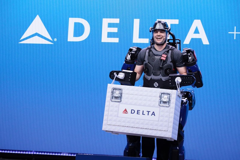 Sarcos Robotics разом з Delta Air Lines представили на виставці екзоскелет, покликаний допомогти робітникам в піднятті важких предметів. Він дозволяє, наприклад, співробітникам аеропортів без зусиль піднімати і переносити вантажі. На фото людина тримає коробку вагою близько 70 кг.