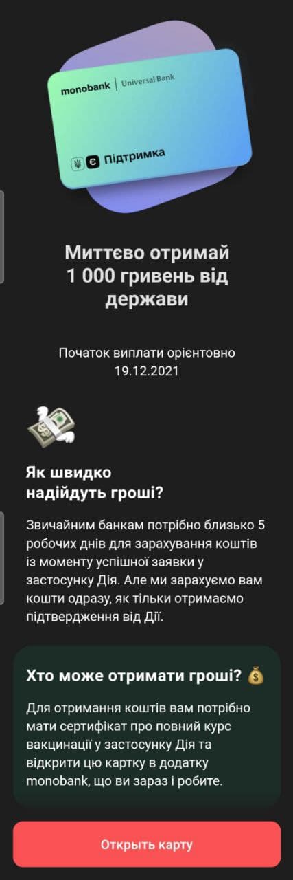 Необанк monobank увійшов до стартового списку банків-партнерів, які першими приєдналися до державної програми «єПідтримка», а співзасновник monobank Олег Гороховський у своєму Telegram-каналі розповів деталі. Відсьогодні monobank починає відкривати карти для одержання вакцинованими клієнтами компенсації 1000 гривень.