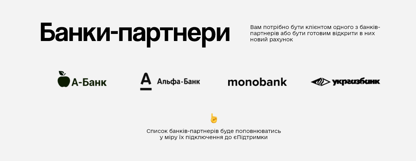 - Надалі список банків-партнерів буде поповнюватись у міру їх підключення до «єПідтримка» (обіцяють, що після фактичного запуску нові банки додаватимуться щодня). Оформлення картки безоплатне як онлайн, так і офлайн у відділенні банку. Використати вже наявний рахунок неможливо.