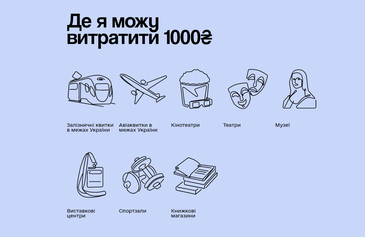 Раніше в уряді повідомляли, що за ці кошти можна буде придбати абонемент у спортзал чи фітнес-клуб, відвідати кінотеатр, театр, музей, концертний зал або купити квитки для мандрівок усередині країни ㅡ на внутрішні авіа- та залізничні рейси, а також придбати книжки. Відтоді нічого не змінилося.