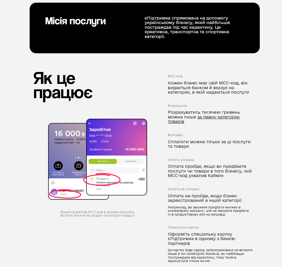 «Ці кошти ви зможете витратити в музеях, театрах, кінотеатрах та книжкових магазинах, а також на внутрішні перевезення. Якщо захочеться купити светр у магазині, оплата не пройде, оскільки ця торгова точка має МСС-код “Одяг”. Це саме стосується книг у супермаркетах. Але якщо ви будете купувати квиток на потяг або в кіно — платіж пройде, оскільки ця торгова точка має відповідний МСС, що підпадає під програму єПідтримки»,