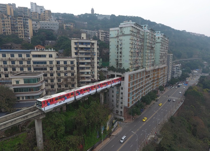 У китайському місті Чунцин поїзд проїжджає крізь житловий 19-ти поверховий будинок. У 2004 році, коли було вирішено продовжити гілку монорельса, перед владою постала проблема: або зносити весь житловий будинок і звільнити місце для монорейки, або зробити тунель прямо через будинок. Влада зупинила вибір на другому варіанті.