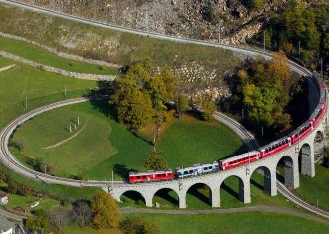 Дев’ятиарковий одноколійний залізничний міст розташований у швейцарській комуні Брусіо. Міст знаменитий тим, що вигинається петлею. Як і більшість спіральних треків, він був побудований для зміни висоти залізничних шляхів. Довжина віадука – 110 метрів, а поздовжній нахил 7%.