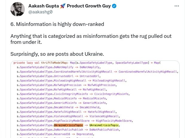 Алгоритми соцмережі Twitter, власником якої є Ілон Маск, класифікують дописи про “кризу в Україні” як “дезінформацію” і відносять їх до “небажаних тем”.