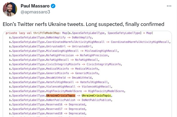 “Твіттер Маска приховує пости про Україну. Давно підозрював, нарешті це підтверджено”, – прокоментував старший політичний радник Гельсінської комісії США Пол Массаро.