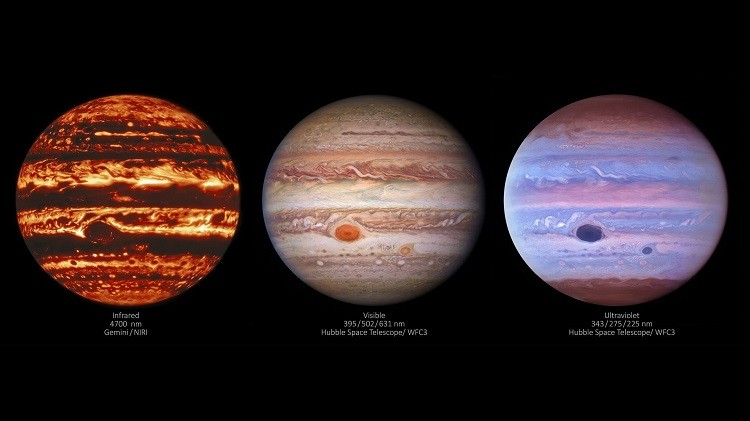 Вчені з США виклали в Мережу недавно оброблені зображення Юпітера, зняті телескопом Hubble й апаратуру обсерваторії Gemini North на Гаваях. Знімки, зроблені в різних діапазонах спектру, дозволяють з’ясувати природу гігантських штормів на планеті.
