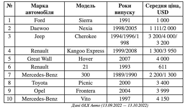 У розрізі моделей українці за останній місяць найчастіше цікавилися Ford Sierra та Daewoo Nexia. Також у першій п’ятірці найпопулярніших авто – позашляховики Jeep Cherokee 90-х років випуску.