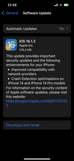 Прошивка вийшла з назвою iOS 16.1.2. Згідно зі списком змін Apple, оновлення покращує сумісність з операторами бездротового зв’язку, а також оптимізує роботу функції Crash Detection на моделях iPhone 14 та iPhone 14 Pro. Крім цього, розробники виправили в системі дрібні помилки.