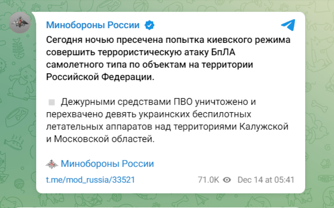 У ніч на 14 грудня дрони намагалися атакувати декілька військових частин у Підмосков’ї. Про це повідомляє Telegram-канал Baza.
