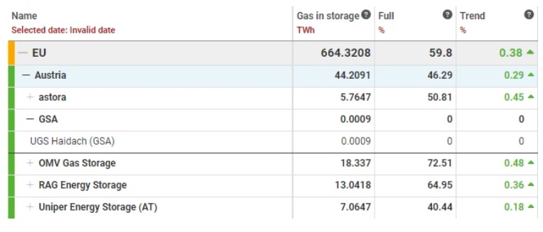 Потужності іншого оператора ПСГ Гайдах – компанії Astora – заповнені на 50,8%, а загалом по Австрії цей показник становить лише 46,29% за цільового рівня 80%.