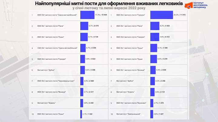 Для порівняння, до початку повномасштабного вторгнення, протягом січня-лютого 2022, в переліку 10 найпопулярніших для ввезення вживаних легковиків пропускних пунктів чотири були морськими. Після початку повномасштабної війни та тимчасового блокування роботи морських портів транспортні потоки змінилися: єдиними “воротами” для ввезення автомобілів як з Європи, так і з Америки, стали пропускні пункти з країнами ЄС та Молдовою.
