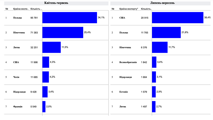 Головними постачальниками легковиків з пробігом протягом липня-вересня стали США (38,4%, 20,9 тис.), Польща (21,6%, 11,8 тис.) та Німеччина (11,7%, 6,4 тис.). Для порівняння, у квітні-червні рейтинг виглядав зовсім по-іншому: лідерами були Польща (34,1%, 95,8 тис.), Німеччина (25,4%, 71,4 тис.) та Литва (11,5%, 32,3 тис.).