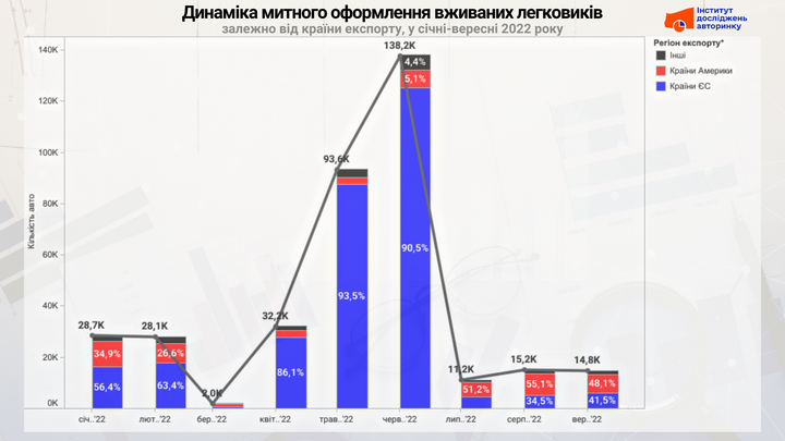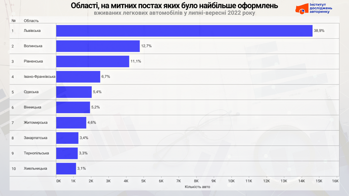 Найбільше вживаних легковиків протягом липня-вересня 2022 року привозили через контрольно-пропускні пункти Львівської та Волинської областей. Лідерами стали КПП “Шегині – Медика” (Львівська обл., 13 478 шт), КПП “Устилуг – Зосин” (Волинська обл., 9 018 шт.) та КПП “Порубне – Сірет” (Чернівецька обл., 2 748 шт.).