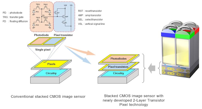 «Оскільки піксельні транзистори, відмінні від передавальних вентилів (TRG), включаючи транзистори скидання (RST), селективні транзистори (SEL) і транзистори підсилювача (AMP), займають шар без фотодіодів, розмір транзисторів підсилювача може бути збільшений. Збільшивши розмір транзистора підсилювача, нам вдалося істотно знизити рівень шуму, якому схильні зображення в нічний час і інші зображення в темряві », – розповіли представники Sony в рамках презентації на Міжнародній конференції з електронних пристроїв IEEE.