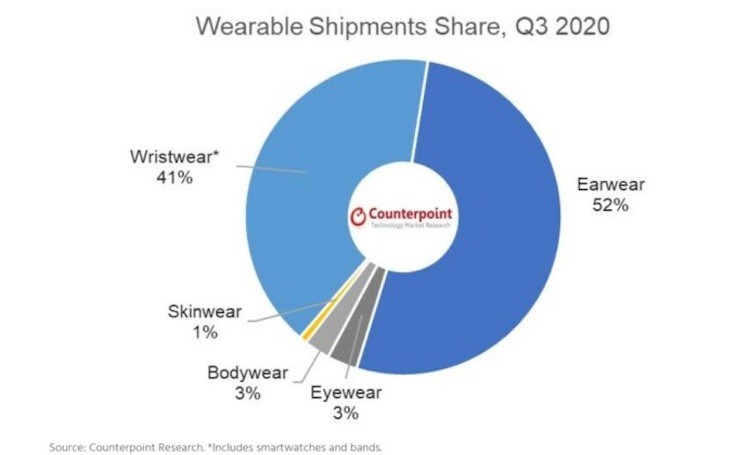Згідно зі звітом дослідницької компанії Counterpoint Research, у 2020 році на бездротові навушники та пристрої, призначені для носіння на руці (розумні браслети та годинники), доводилося 93 відсотки від загального обсягу поставок ношених пристроїв. Торік було продано близько 238 мільйонів TWS-навушників, що на 83 відсотки більше, ніж у 2019.