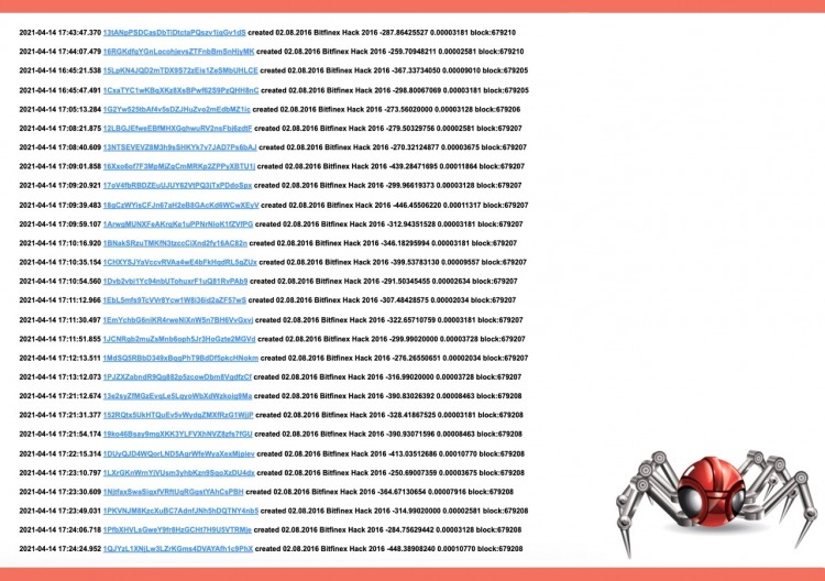Використовуючи синтаксичний аналізатор блокчейну Btcparser виявив, що 11 799 BTC з вкрадених у Bitfinex біткоїнів у 2016 році, були перенесені в середу на гаманці з висотою блоку від 679 205 до 679 214. Було зафіксовано понад 30 трансакцій, що є одним з найбільших рухів вкрадених у Bitfinex засобів.
