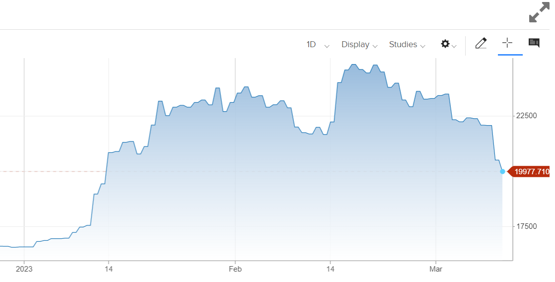 Ринок криптовалют втратив понад $70 млрд з 8 до 10 березня. За даними CoinDesk, біткоїн впав майже на 8%, до $19 900. Етеріум також подешевшав на 8%, до $1400. Наразі падіння триває – зараз біткоїн коштує $19779.