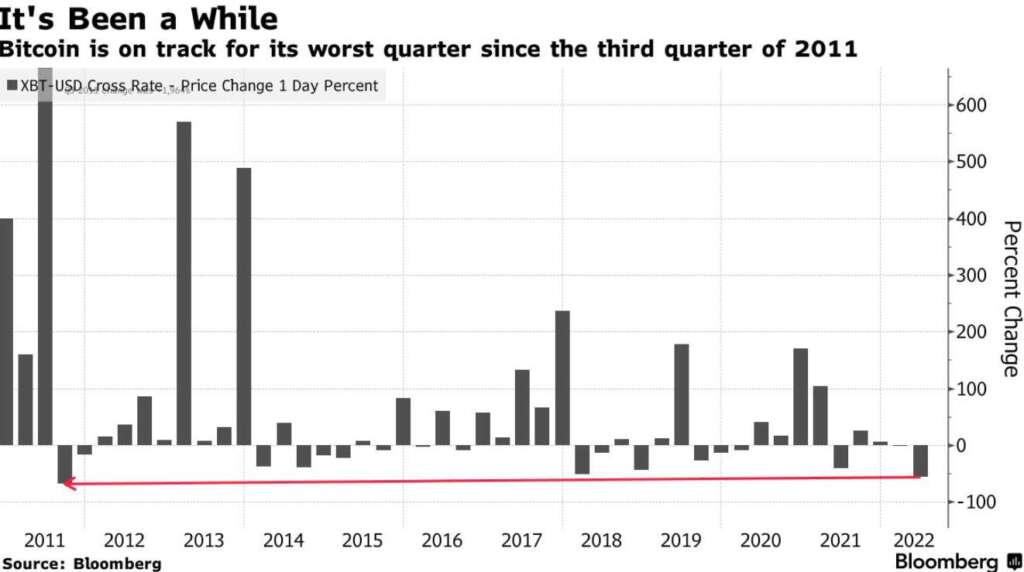 Біткоїн перебуває на шляху до гіршого кварталу за більш ніж десятиліття, оскільки центробанки та низка гучних криптовалютних провалів негативно позначаються на настроях інвесторів. Падіння біткоїну на 58% є найбільшим із третього кварталу 2011 року.