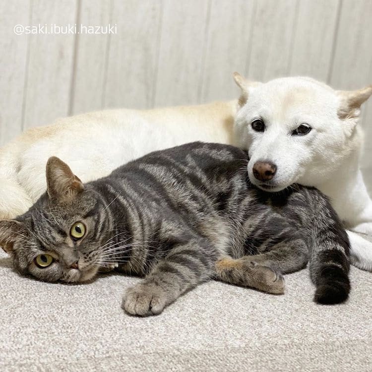 Зазвичай у кішок та собак дуже бурхливі і неспокійні відносини, проте в Японії живе одна щаслива пухнаста сім’я, яка доводить, що це не так. Знайомтеся, це Кікі (Kiki), чарівна кішка породи американська короткошерста, яка мирно живе зі своїми трьома братами та сестрами породи Шіба-іну: Саки (Saki), Ібукі (Ibuki) і Хадзукі (Hazuki).