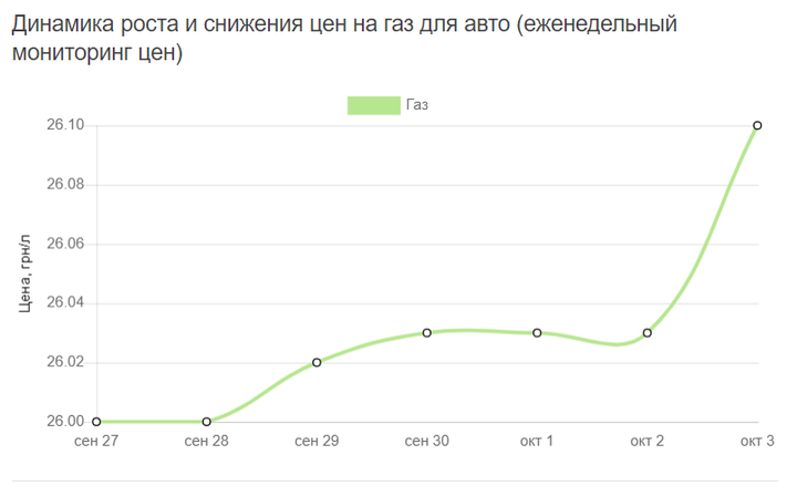 Середні ціни на автогаз в Україні підскочили на сім копійок і становлять 26,10 грн.