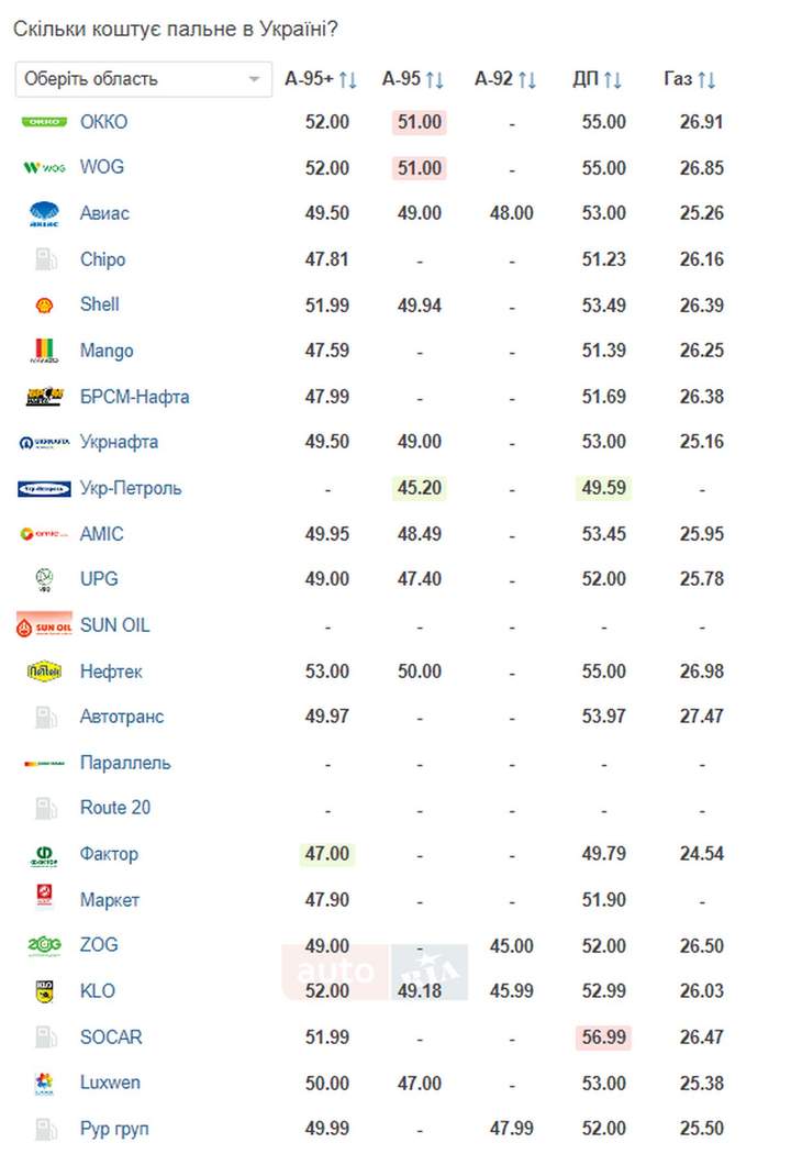 Дизельне пальне за найнижчими цінами можна придбати на таких АЗС: Укр-Петроль (49,59 грн/л), БРСМ-Нафта (51,69 грн/л), UPG, Рур груп (52 грн/л), KLO (52,99 грн/л), Укрнафта, Авіас (53 грн/л).