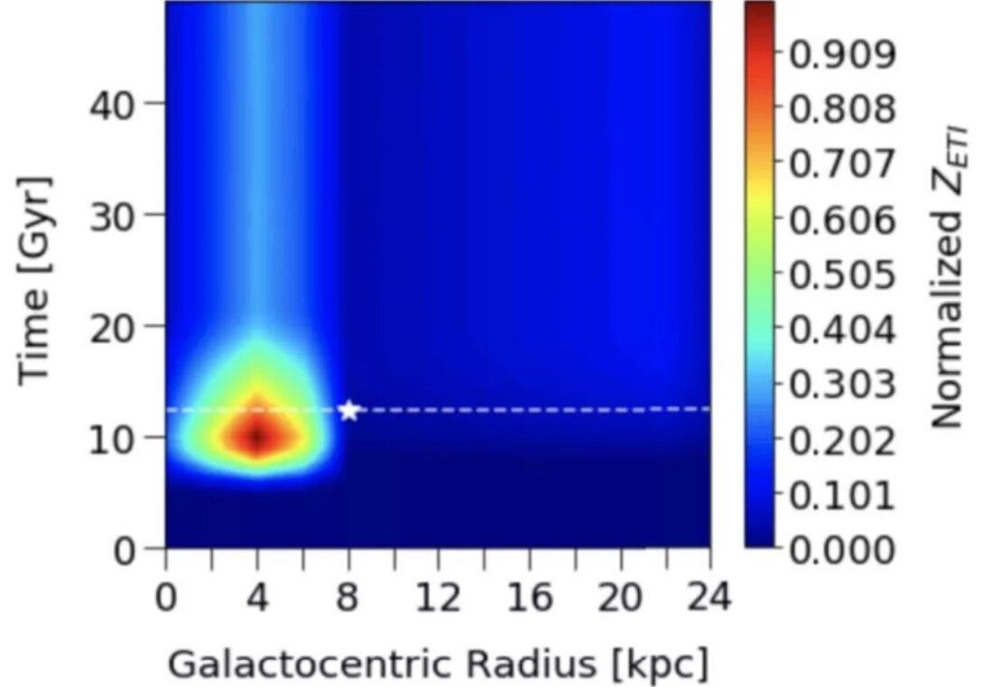 Моделюючи еволюцію Чумацького Шляху в часі з урахуванням цих факторів, вчені виявили, що ймовірність появи життя досягає піку приблизно в 13 тис. світлових років від центру галактики та через 8 млн років після утворення самої галактики. Для порівняння, Земля знаходиться приблизно у 25 тис. світлових років від центру галактики, а людська цивілізація виникла через 13,5 млрд років після утворення Чумацького Шляху.