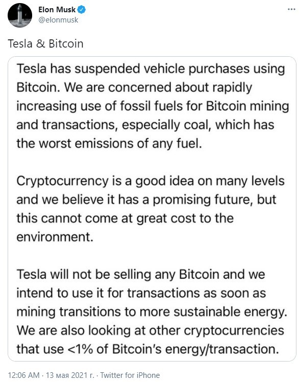 «Tesla призупинила продажі автомобілів з використанням біткоїна. Ми стурбовані зростаючим використанням викопного палива для забезпечення видобутку та транзакцій біткоїна, особливо вугілля, який має найгірші показники шкідливих викидів серед усіх видів палива» — йдеться у твіті Маска.