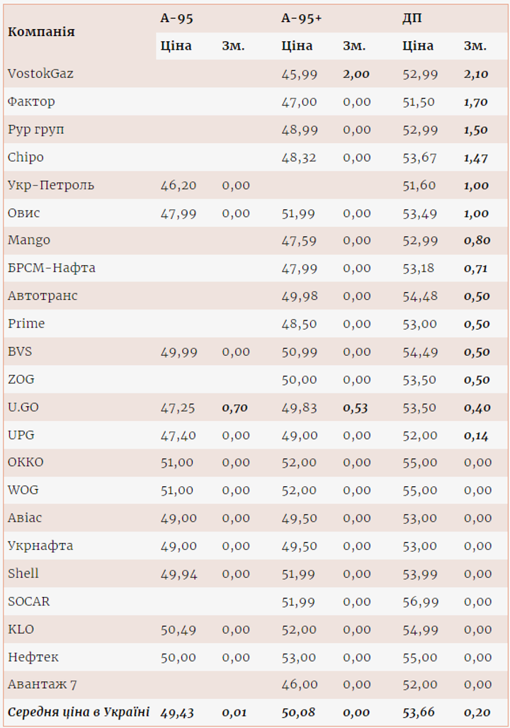 «Автотранс», Prime, BVS й ZOG підвищили ціни на дизпальне на 50 коп./л. На станціях «Рур груп», «Chipo», Mango, «БРСМ-Нафта», U.GO і UPG дизельне пальне здорожчало на 0,14-1,5 грн/л.