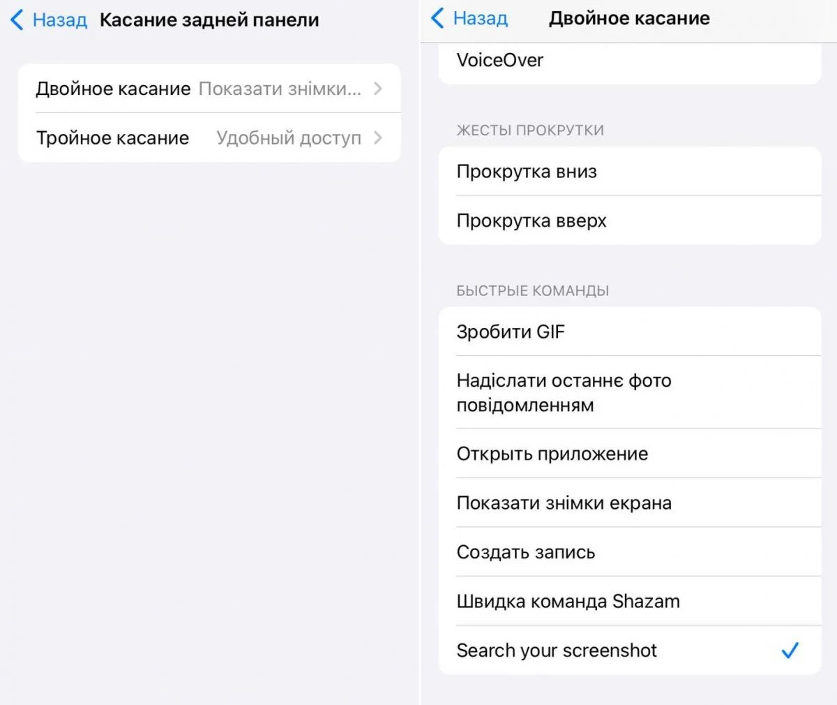 - У налаштуваннях розділу “Спеціальні можливості” вибрати “Подвійний” або “Потрійний дотик” для активації бажаної дії шляхом торкання тильної панелі смартфона.