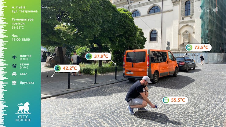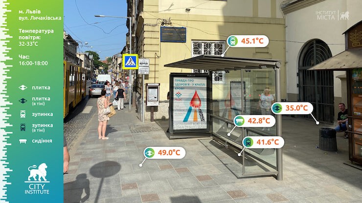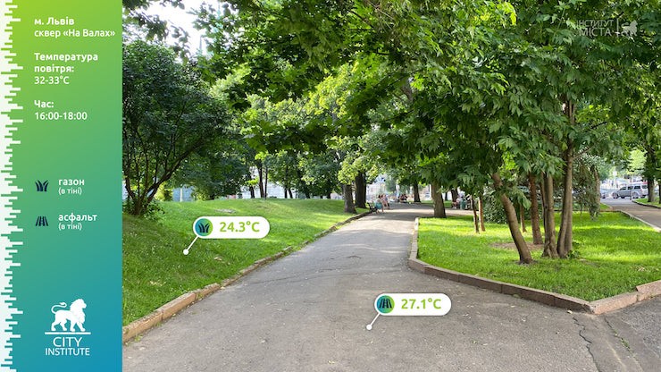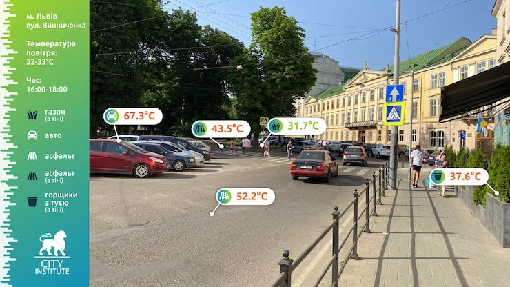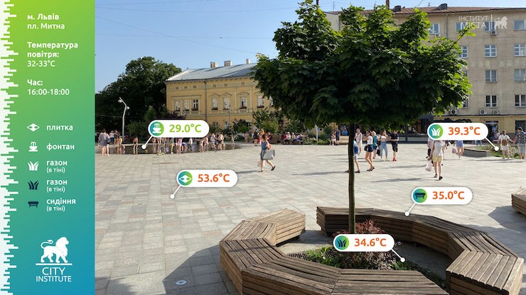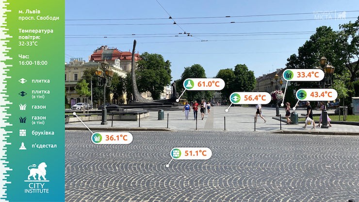 24 червня температура повітря у Львові сягала 32-33 градуси. У цей день із 16:00 до 18:00 «Інститут міста» виміряв температуру різних поверхонь у центрі міста.