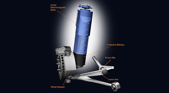 Діапазон переміщення лінійних електромоторів складає десятки сантиметрів. Пасажири, що сидять в салоні автомобіля з електромагнітною підвіскою, абсолютно не відчувають поштовхів під час їзди по пересіченій місцевості. Електричний мотор, який використовується в якості амортизуючого елемента, має здатність до рекуперації. Це означає, що частина витраченої енергії повертається на підсилювачі. Для експлуатації електромагнітної підвіски потрібно потужність, якої вистачить для живлення трьох автомобільних кондиціонерів.