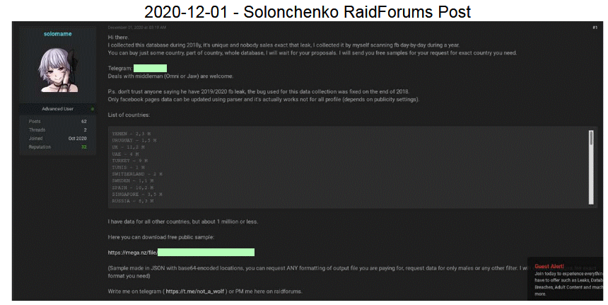 За версією Facebook, з 2020 року Солонченко також викрав і виставив на продаж дані найбільшого комерційного банку України, найбільшого в Україні приватного сервісу доставки, а також французької аналітичної компанії. Бувши програмістом-фрілансером, він володів мовами Python та PHP, вмів працювати з програмою Xrumer для масової розсилки повідомлень, а також мав досвід в автоматизації завдань в емуляторах Android. Приблизно до червня 2019 року, за версією позивача, він також продавав в Мережі взуття, працюючи під брендом Drop Top.