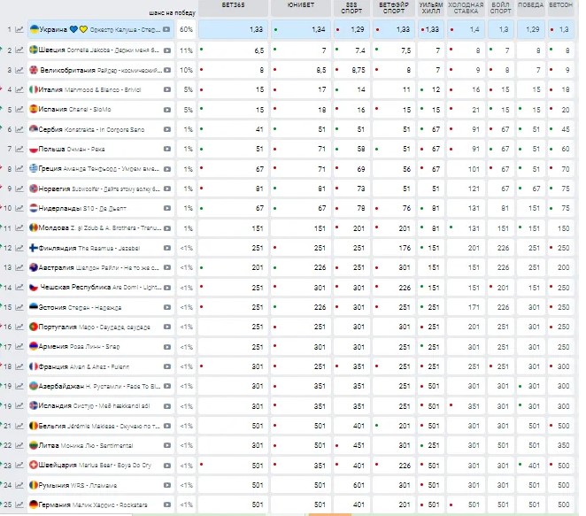 За кілька годин до гранд-фіналу букмекери змінили ставки. Україні, як і раніше, вони обіцяють 60% перемоги. А от Швеція, якій прогнозували “бронзу”, стала на місце Великобританії. Остання займала другу сходинку у букмекерській таблиці, проте надвечір 14 травня опинилася на третій.