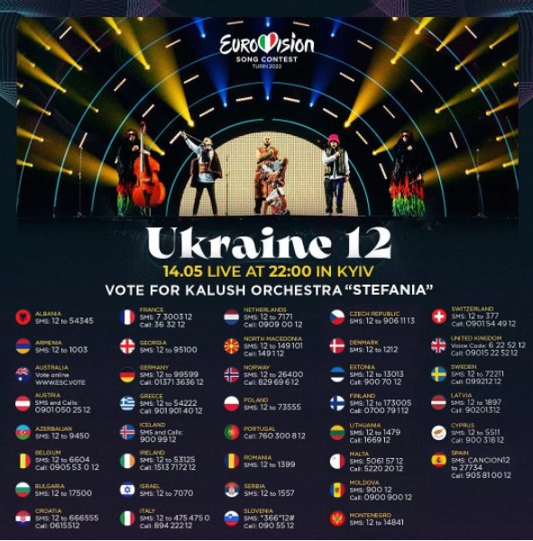 Українці за кордоном можуть проголосувати за Kalush Orchestra Для цього потрібно надіслати SMS-повідомлення з цифрою 12 на номер країни, де ви знаходитесь. Кількість голосів необмежена.