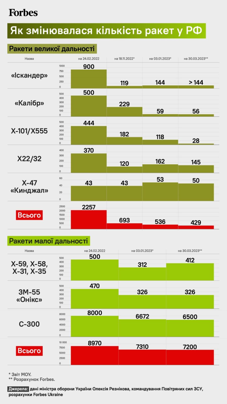 На момент початку повномасштабної війни однією з переваг російської армії була наявність далекобійних ракет. ЗС рф мали можливість наносити ракетні удари по всій території країни, тоді як ЗСУ могли робити це тільки в радіусі 120 км від місця розташування установки “Точка-У”. У міру вичерпання запасів ракет Х-101, Х-555 і “Калібр” армії рф довелося перейти на використання неточних ракет Х-22 і дорогих Х-47 “Кинджал”. Поряд з цим, кремль знизив інтенсивність ракетних атак.