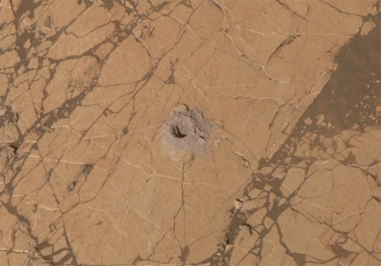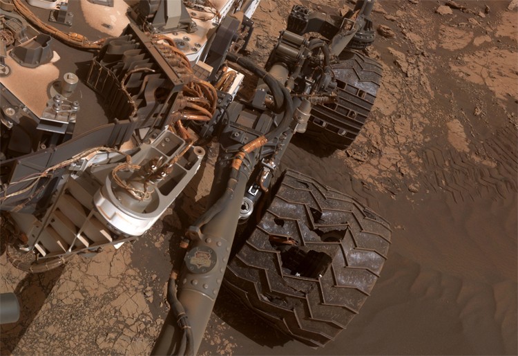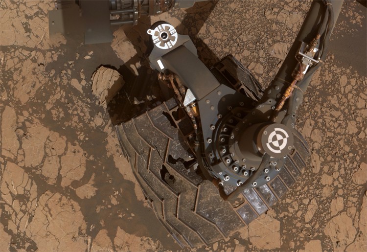 Видно, що елементи конструкції марсохода покриті шаром бурого пилу. Колеса в процесі руху по кам’янистій поверхні отримали дуже серйозні пошкодження, проте, Curiosity продовжує виконання наукової програми.