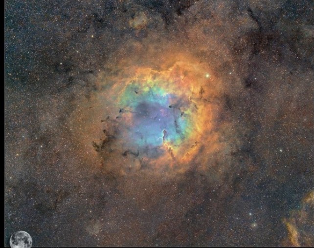 У панорамі знаходяться 20 мільйонів зірок. Різні кольори в мозаїці позначають випромінювання іонізованих елементів. Так, зелений колір – «символ» водню, червоний – сірки, а синій – кисню.