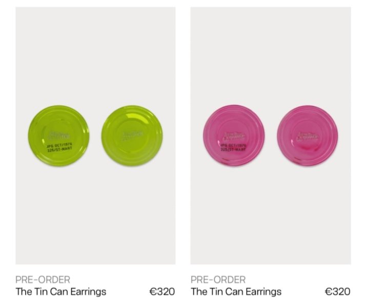 Французький кутюр’є Жан-Поль Готьє відомий своєю любов’ю до всього яскравого, відвертого, зухвалого та незвичайного. Модельєр уже два роки як вийшов на пенсію, але його модний дім продовжує творити, залучаючи молодих дизайнерів до створення нових колекцій. На тижні моди в Парижі цього липня представили безліч робіт, натхненних одним зі знакових творів кутюр’є — упаковкою парфумів у вигляді консервної банки. Металева фактура повторювалася в сукнях, взутті, а також аксесуарах. А нещодавно в продажу з’явилися лаймово-зелені та рожеві сережки з бляшанки з логотипом Jean Paul Gaultier. Вартість аксесуара — 320 євро.