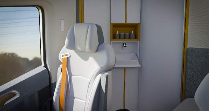 В інтер’єрі, що нагадує затишну вітальню космічного човника, використовуються екологічні матеріали. І є всі зручності, необхідні далекобійникам в дорозі, включаючи ванну кімнату з душем і туалетом, односпальне ліжко, холодильник, кухонну зону і навіть компактну пральну машину.