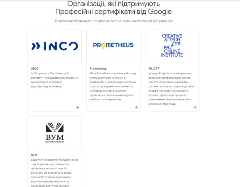 INCO (одержувач гранту від Google.org) надає українцям, які втратили роботу або ризикують її втратити, до 5000 стипендій, які покривають доступ і повну підтримку до навчання від Google на Coursera. Програма професійної сертифікації Google підійде як новачкам, так і спеціалістам із досвідом роботи у вибраній сфері.