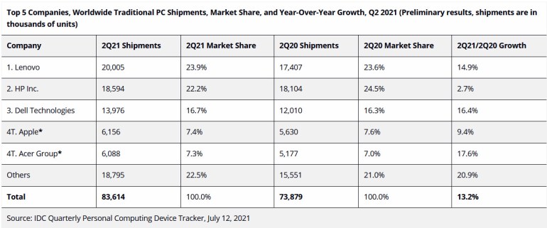 Як свідчать дані аналітичної компанії IDC, в другому кварталі 2021 року спостерігалося постійне зростання попиту на комп’ютерну техніку. Навіть з урахуванням глобальної нестачі компонентів та проблем з логістикою, світові поставки ПК (включаючи настільні комп’ютери, ноутбуки та робочі станції), досягли 83,6 млн одиниць. Це на 13,2% більше, ніж у другому кварталі 2020 року. При цьому підвищений попит на ПК в поєднанні з дефіцитом, який сильно вплинув на пропозицію ноутбуків, привів до того, що в цьому періоді зростання поставок настільних комп’ютерів випер зростання продажів ноутбуків.