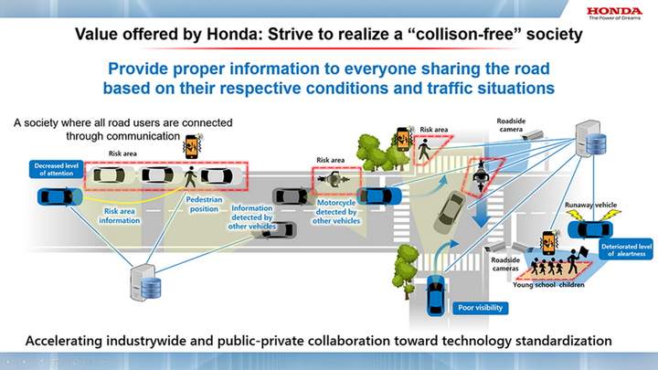 Honda також інвестує в технології V2X, які з’єднують транспортні засоби з іншими учасниками дорожнього руху через мережі зв’язку. Використовуючи інформацію з придорожніх камер, бортових камер інших транспортних засобів і смартфонів, дані можна об’єднати, щоб пропонувати водіям інформацію про їхнє середовище дорожнього руху. Автовиробник планує використовувати штучний інтелект для моделювання поведінки учасників дорожнього руху з високим ризиком зіткнення та вжити заходів, щоб підтримати водія інформацією, яка допоможе уникнути ризику.