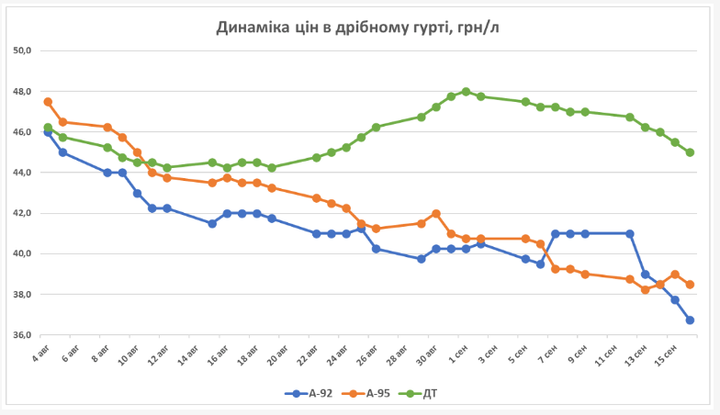 У північному й центральному регіонах вартість ДП за тиждень знизилась не так стрімко, на 1-2 грн/л, і 16 вересня торгівля в цих областях велася в межах 44-48 грн/л.