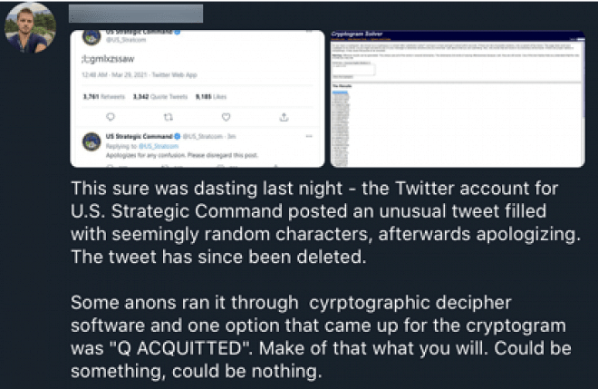 «Хтось з анонів пропустив його (текст твіту) через криптографічний розшифровщик, і одним з варіантів для криптограми було” Q ВИПРАВДАНИЙ “. Думайте що хочете. Може, в цьому є щось, а може, немає».