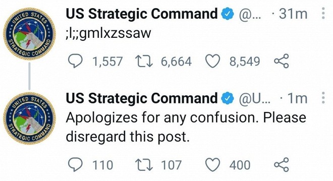 У твіттері стратегічного командування США, яке об’єднує ядерні сили, сили ПРО та космічні війська, з’явився дивний текст «; l; gmlxzssaw.». Незабаром він був видалений, а відомство попросило вибачення і попросило не звертати на нього уваги, однак пост помітили користувачі і ЗМІ.
