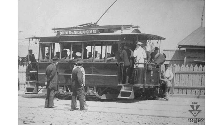 Один з перших київських трамвайних вагонів. Маршрут проходив від нинішньої Європейської площі до нинішньої Контрактової площі.