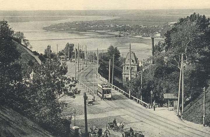 Такий вид мав в кінці позаминулого століття Володимирський узвіз столиці. Трамвайні колії відокремлені від проїжджої частини