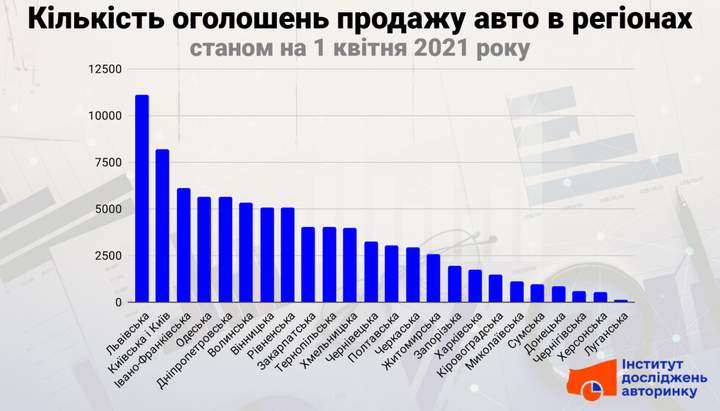 Кількість оголошень продажу автомобілів в регіонах України на auto.ria.com, станом на 1 квітні 2021 року