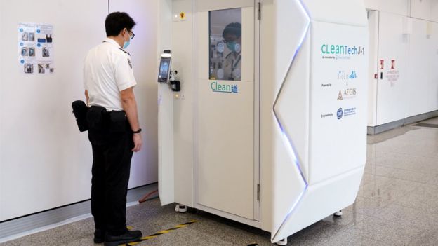 У міжнародному аеропорту Гонконгу зараз проходить тестування прилад, який за 40 секунд здійснює повну дезінфекцію: він здатний знищити як бактерії, так і віруси на шкірі і одязі.
