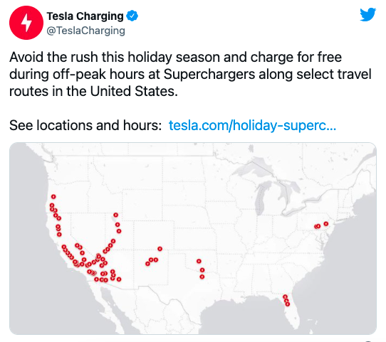 Рішення Tesla щодо боротьби з перевантаженнями цього року полягає у пропозиції безкоштовної зарядки в не піковий час. Ця пропозиція доступна лише на 75 станціях зарядки приблизно з 1 400 станцій Tesla Supercharger в США.